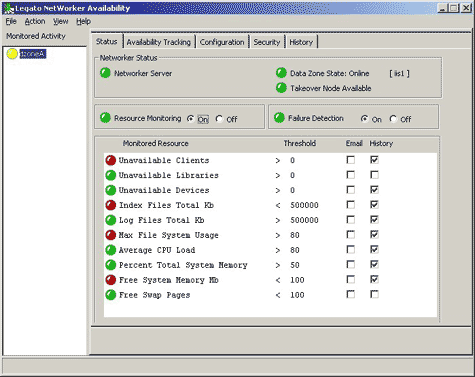 NetWorker Availability provides centralized monitoring, notification on events and historic tracking of NetWorker Servers and host resources. The Status Tab is one of the three screens used following configuration - it offers:
