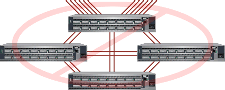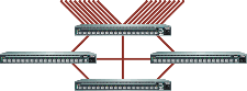 Figure 1 - Building a mesh with a Slingshot 4218 2Gb open fabric switch (lower diagram) creates 60 user ports, compared to only 40 user ports using legacy 1Gb, 16-port switches (upper diagram). |