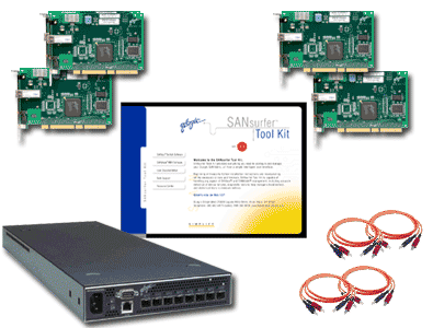 We are pleased to announce the new SAN Connectivity Kit 2GB, a turn-key storage area network designed to give IT professionals in small- to medium- sized businesses a simple, affordable entry to the benefits of SANs. Designed for high I/O applications, the SAN kit is comprised of a Fibre Channel switch, Fibre Channel HBAs, SAN management software, cables, and small form factor pluggables (SFPs) -- all the connectivity components necessary to get a SAN up and running.