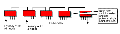 due to compound latency caused by multiple switch-to-switch "hops,"