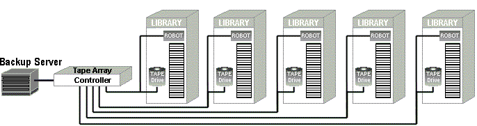 Starting with the lowest slot number, a logical tape volume set occupies the same slot number in each library. For example, five independent tape libraries can be attached to the system with a logical drive set size equal to 5. This would mean the system is set to a Mirroring 5 (or a Striping 4+1) operating mode and data is either striped or mirrored across the tape libraries to the appropriate drive set.